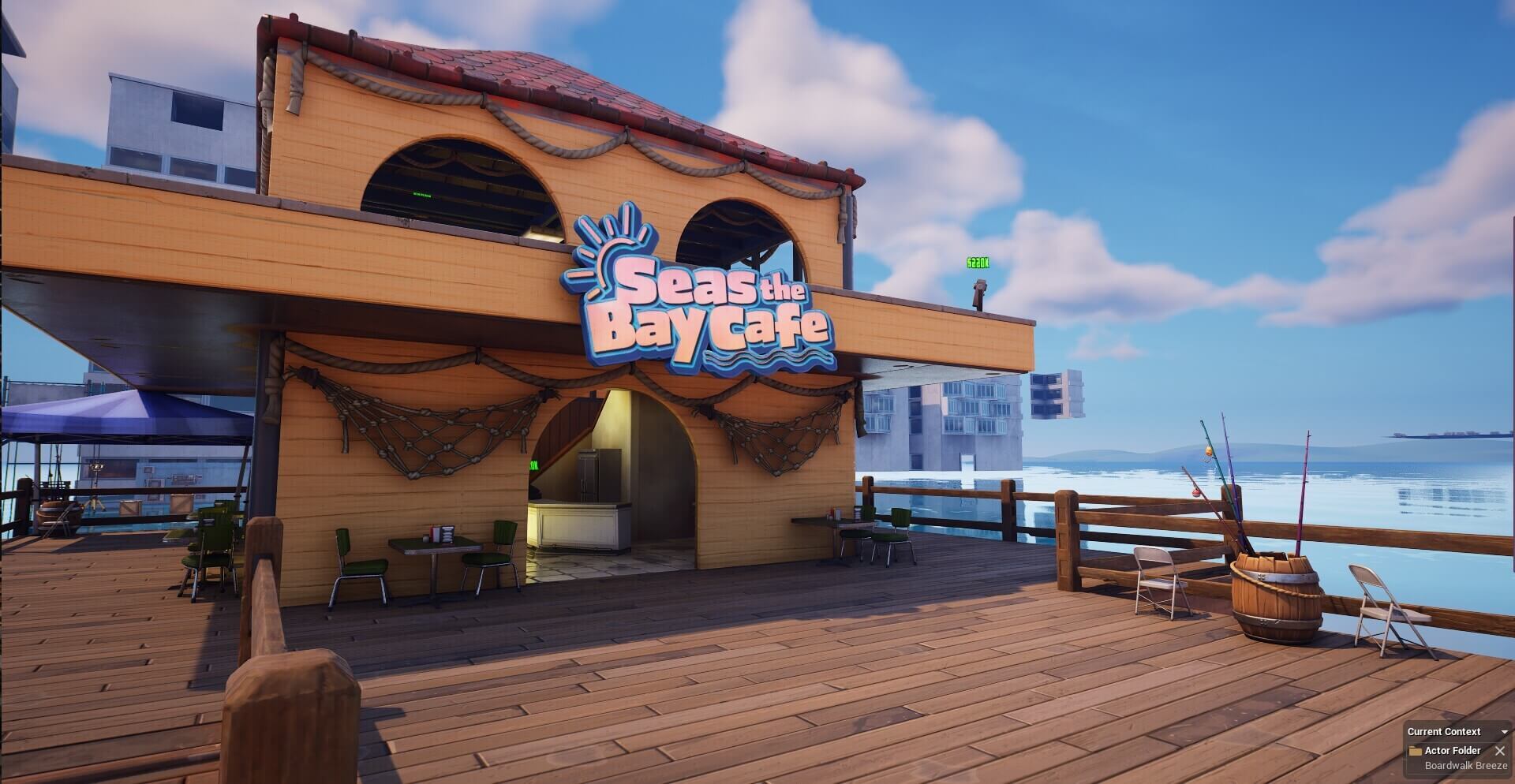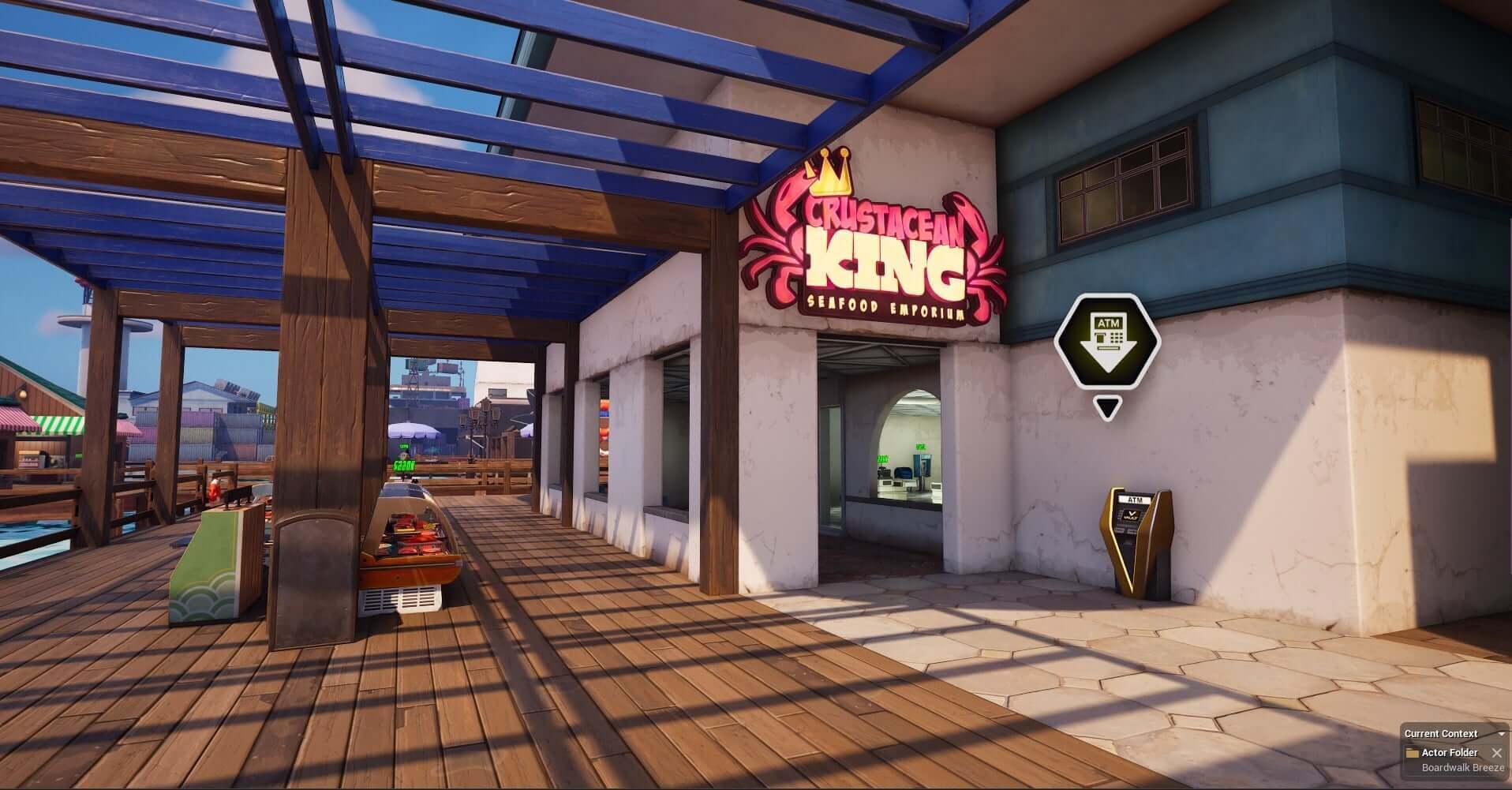 Crustacean King: A signature location defined by bold signage and custom shader work. Its glowing storefront draws players into the boardwalk, making it a natural hotspot for movement and encounters.