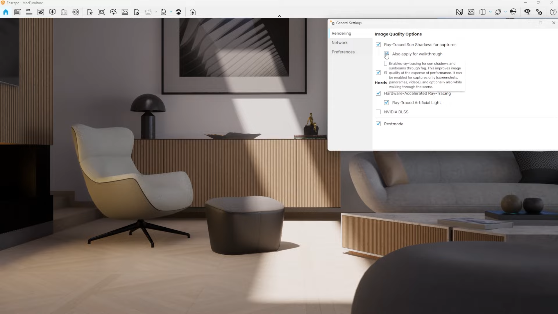 Enscape now delivers more realistic lighting with accurate colored shadows, even on computers that don’t support hardware ray tracing.