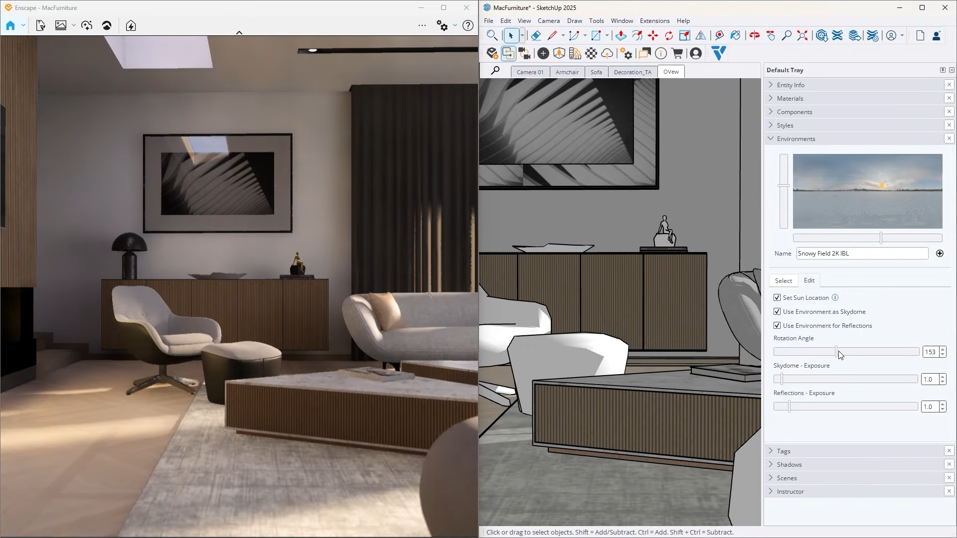 SketchUp 2025 introduces a new environmental sun control, and Enscape now fully respects it.
