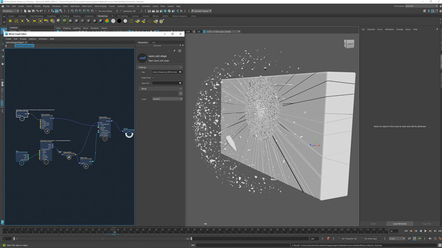 NodeWorks Voronoi fracture scene in Bifrost. Alembic cache: 100 frames, 49 Mb file size.
