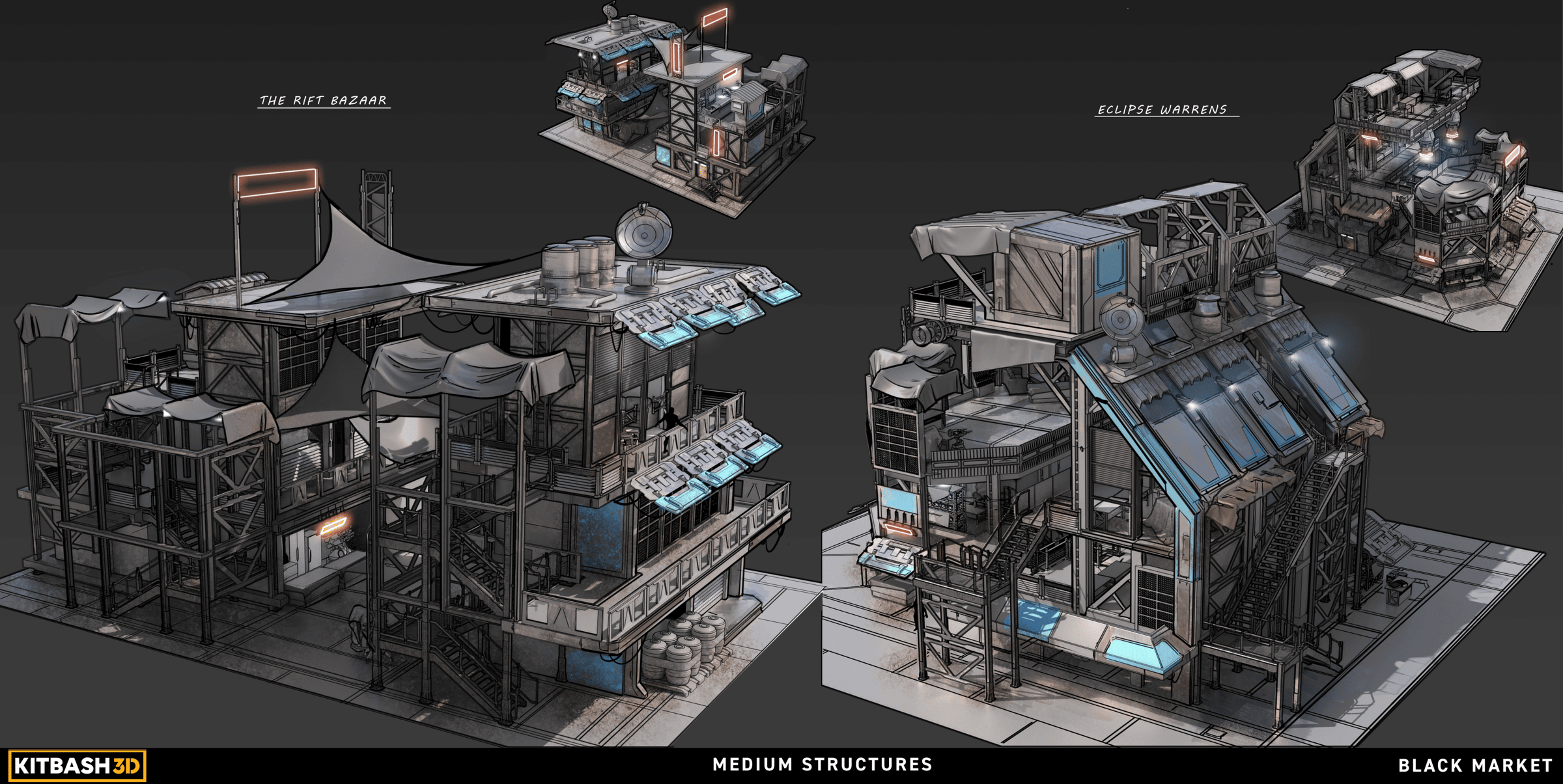 That environment now exists for 3D creators with the launch of KitBash3D’s new Black Market Kit, a beautifully gritty world-building package that blends cyber-noir atmosphere, layered structures, and cinematic modular design.