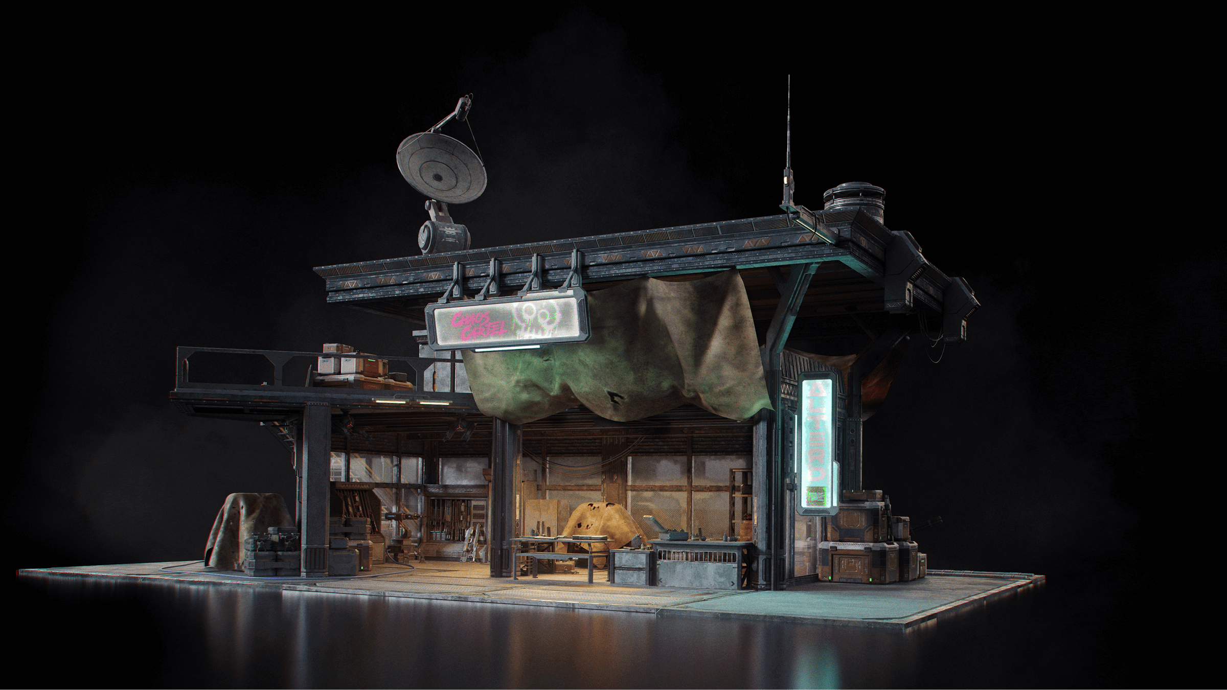 From concept to modeling to material work, they blended real-world market influence, southern bazaar architecture, and iconic sci-fi inspirations, including nods to Blade Runner, tactical surveillance hubs, mech-enabled patrol zones, and off-grid trading outposts.